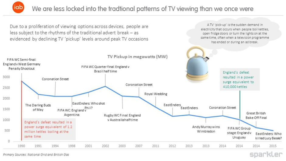 Furthermore, the declining “kettle power surge” during ad breaks in peak TV occasions over the last 25 years provides more evidence of the change in the traditional rhythm of the living room. During the biggest TV event in 1990 – England’s World Cup semi-final against West Germany – National Grid data compiled by British Gas shows a power surge equivalent to 1.12 million kettles boiling at the same time immediately after the match. In 2014’s biggest TV event – England’s World Cup match against Uruguay – the power surge was the equivalent of only 410,000 boiling kettles.