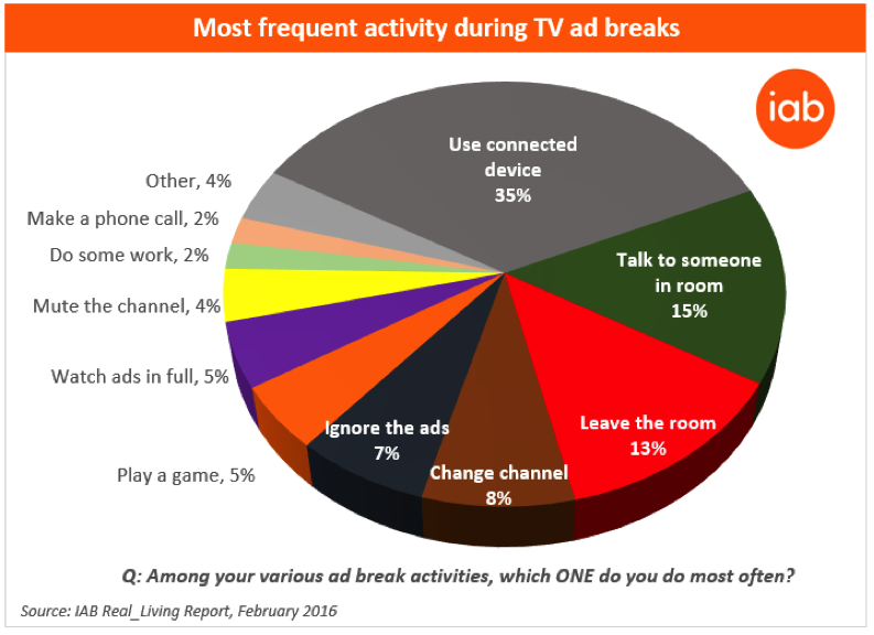 Among the various activities people do during an ad break, the one they do most often is going online via a connected device (35%) followed by talking to someone in the room (15%), leaving the room (13%) and changing the channel (8%).