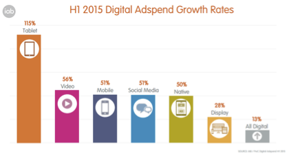Ad spend on mobiles increased 51% to £1.08 billion in the first half of 2015. The actual increase of £370 million year-on-year accounts for 79% of the rise in digital ad revenues.